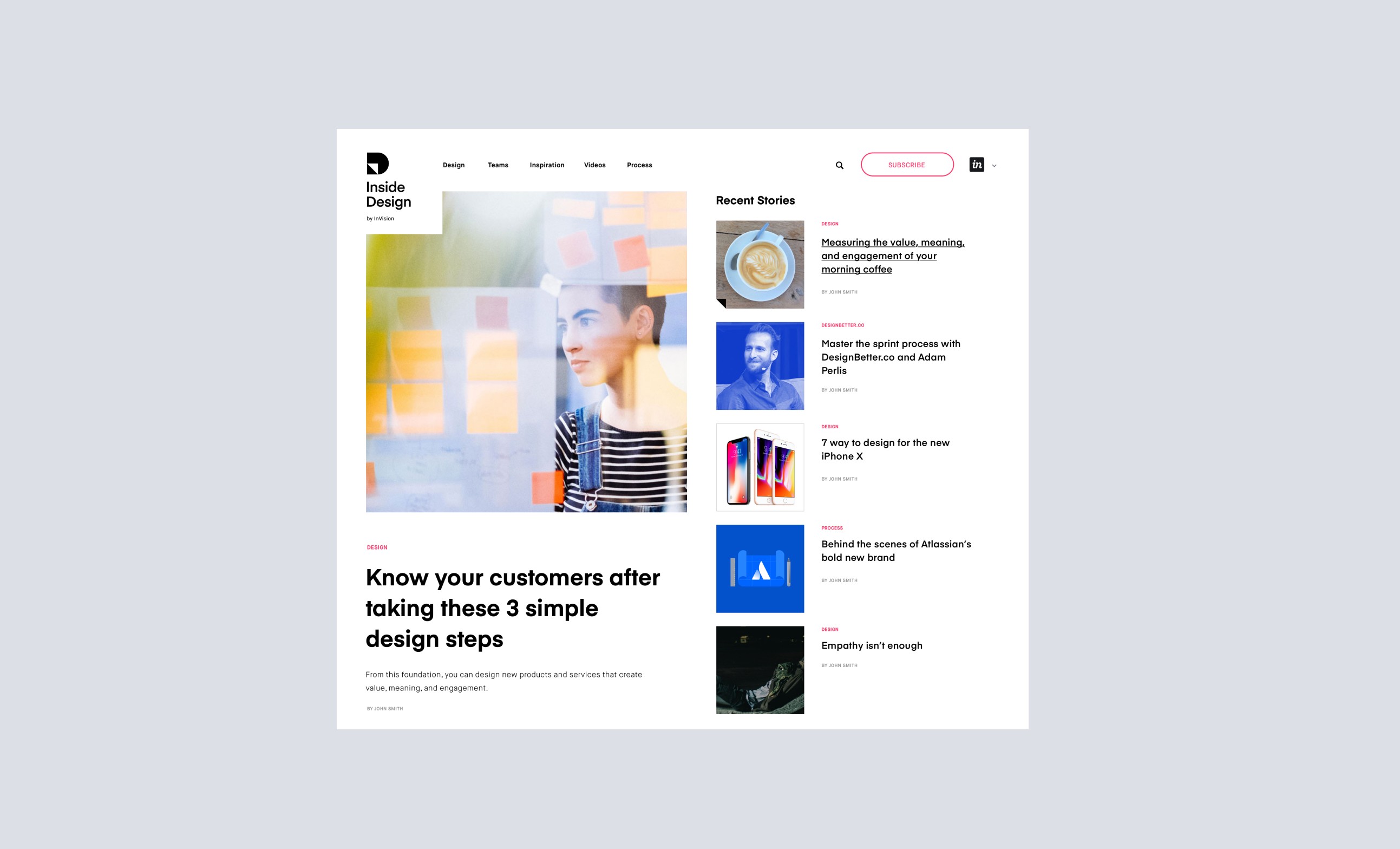 Redesiged and launched InsideDesign, a content platform with over 100 million subscribers. Shaped the brand and design direction for Design Exchange and the Customer Stories site, raising the quality and consistency of InVision’s web presence at a pivotal moment in the company’s growth.